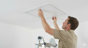 ในการติดตั้งก แผงเข้าถึงเพดาน คุณต้อง วัดหน้าแปลนด้านในของแผง ให้ตัดรูที่สอดคล้องกันในผนังยิปซั่มโดยหลีกเลี่ยงตงเพดาน และยึดโครงให้แน่นโดยใช้กาวสำหรับงานก่อสร้างหรือตัวยึดเชิงกล สำหรับประปาที่อยู่อาศัยมาตรฐานหรือการเข้าถึงไฟฟ้า แผงพลาสติกขนาด 12x12 นิ้ว เป็นตัวเลือกที่พบบ่อยที่สุดเนื่องจากมีน้ำหนักเบาและติดตั้งง่าย